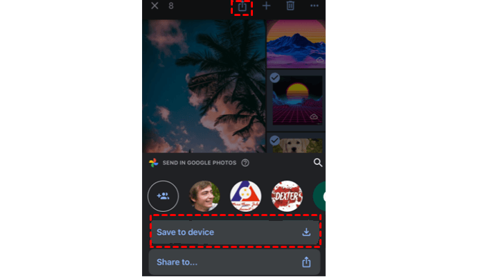 Passo 3: Selecione as fotos que você deseja transferir para o iCloud e clique no botão no lado superior. E depois clique em “Salvar no dispositivo”. Então essas fotos serão automaticamente sincronizadas com seu iCloud.