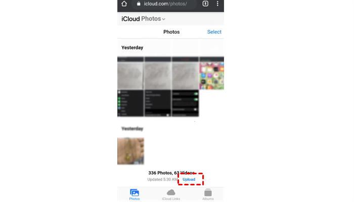 Passo 4: Selecione as fotos que você baixou do Google Fotos para fazer upload clicando em “Upload” na parte inferior.