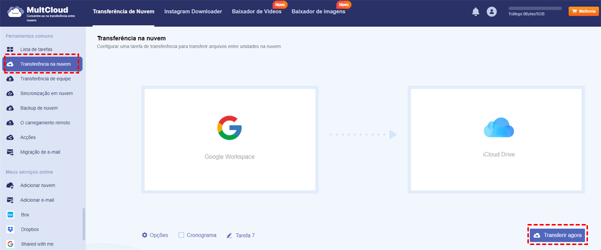 Se você está procurando uma ferramenta que possa migrar diretamente emails, documentos ou fotos para o iCloud sem a necessidade de exportação e importação, o MultCloud é ideal. O MultCloud é dedicado a gerenciar várias nuvens com um aplicativo e oferece funções profissionais de transferência em nuvem. Para migrar do Google Workspace para o iCloud, você pode usar a Transferência na nuvem e Migração de Email.