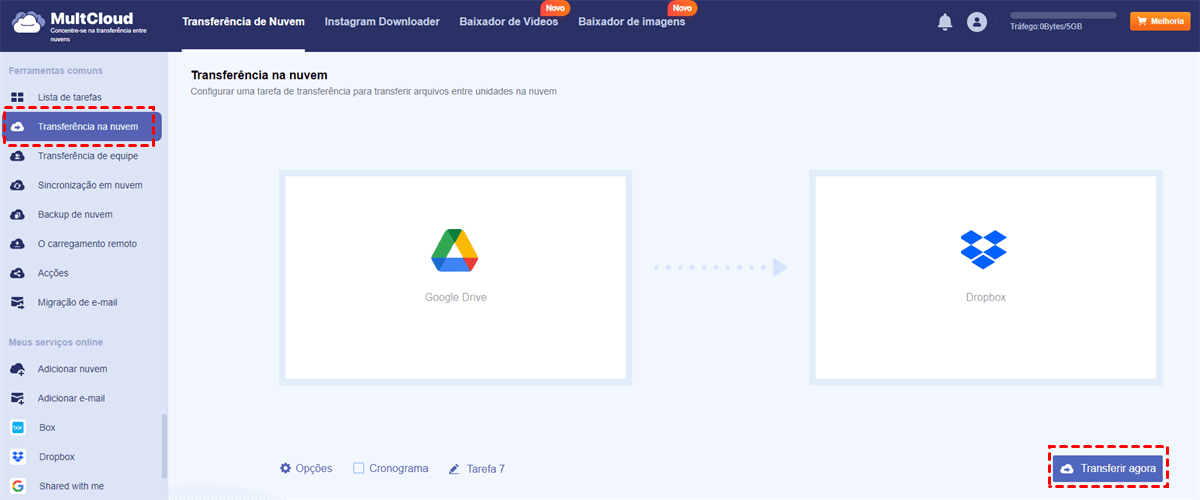 Então, como transfiro dados de um armazenamento em nuvem para outro via MultCloud? Agora, você pode consultar as seguintes orientações. Usaremos como exemplo a transferência do Google Drive para o Dropbox.