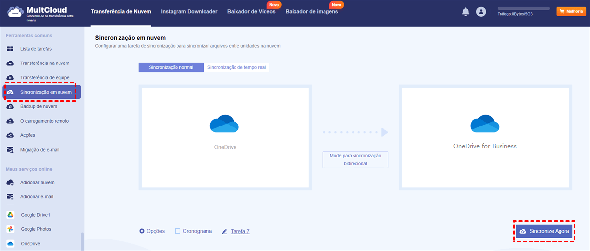 Além da "Transferência na nuvem" mencionada acima, você também pode sincronizar os dados de uma das contas OneDrive com a outra através de "Sincronização em nuvem" para movimentação de dados. Basta ir para a interface "Sincronização em nuvem", selecionar a origem e o destino respectivamente e, por fim, clicar em "Sincronize Agora" para concluir a migração dos dados.