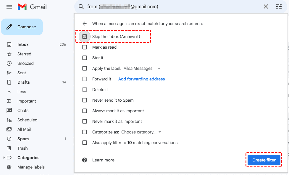 5. Tick the box that says “Skip the Inbox (Archive it)” in filter options, and hit Create filter. Once you confirm the filter, Gmail will begin automatically archiving incoming emails that meet the defined conditions.