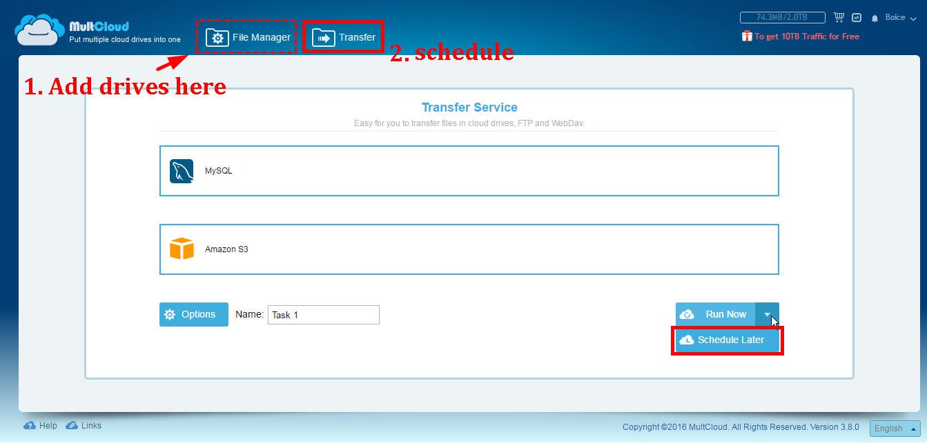With the flexible schedule and practical management of backup versions, you are going to benefit a lot from using MultCloud to automatically backup MySQL database to S3 for completely free. You could also use Cloud Backup to backup MySQL to Google Drive and other cloud storage services.