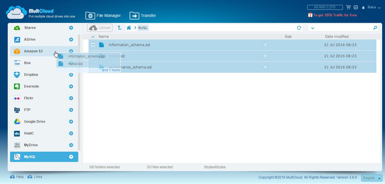 - MultCloud offers 5 GB of free data traffic for each user to transfer data between clouds every month. If you have lots of data that need to be backed up, or you need to backup MySQL to Amazon S3 very often, you can upgrade to a premium plan and thus get data traffic from 150 GB to unlimited according to your subscription.