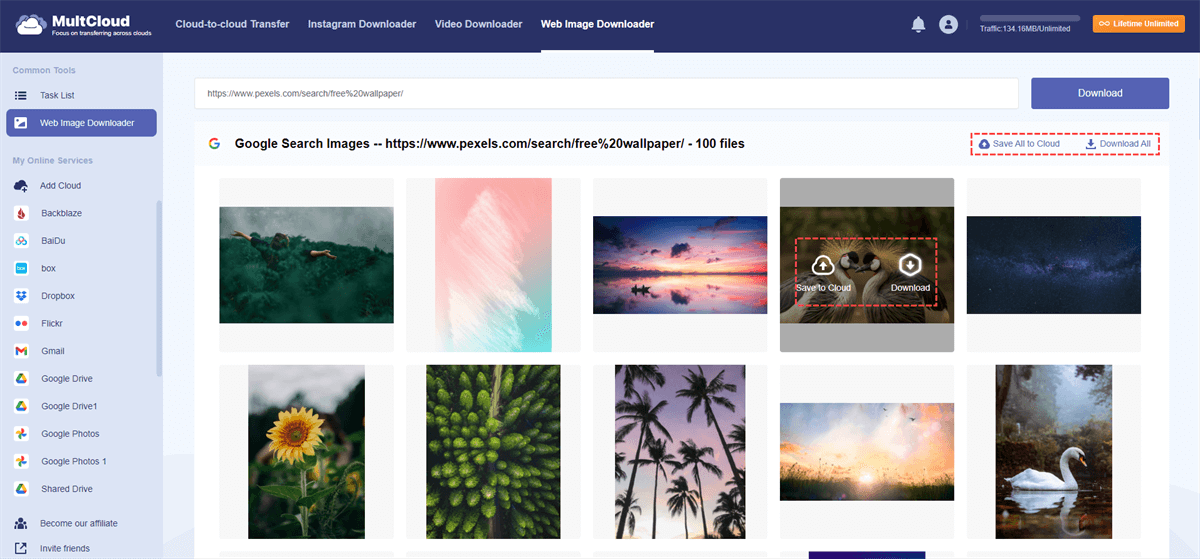 MultCloud is an online cloud management platform that connects all your cloud services (like Google Drive, Dropbox, OneDrive, etc.) and helps you move or download files between them with ease—no downloads to your local drive required. What’s more, with "Web Image Downloader" and "Remote Upload", you can directly bulk download images from URLs to your local or cloud storage.