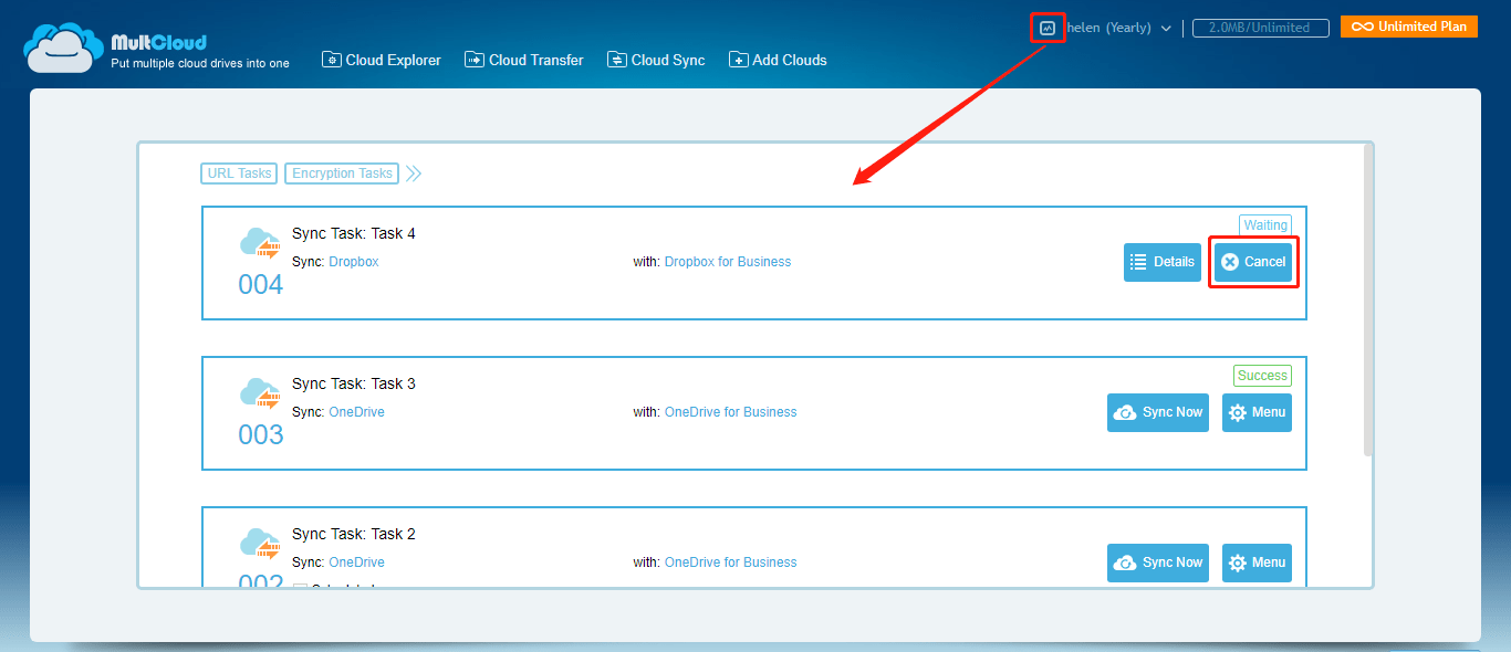 You can view the sync task in Task Manager by clicking the little icon on upper right. If the task is still running, you can stop it by clicking “Cancel” button at the end of the task column.
