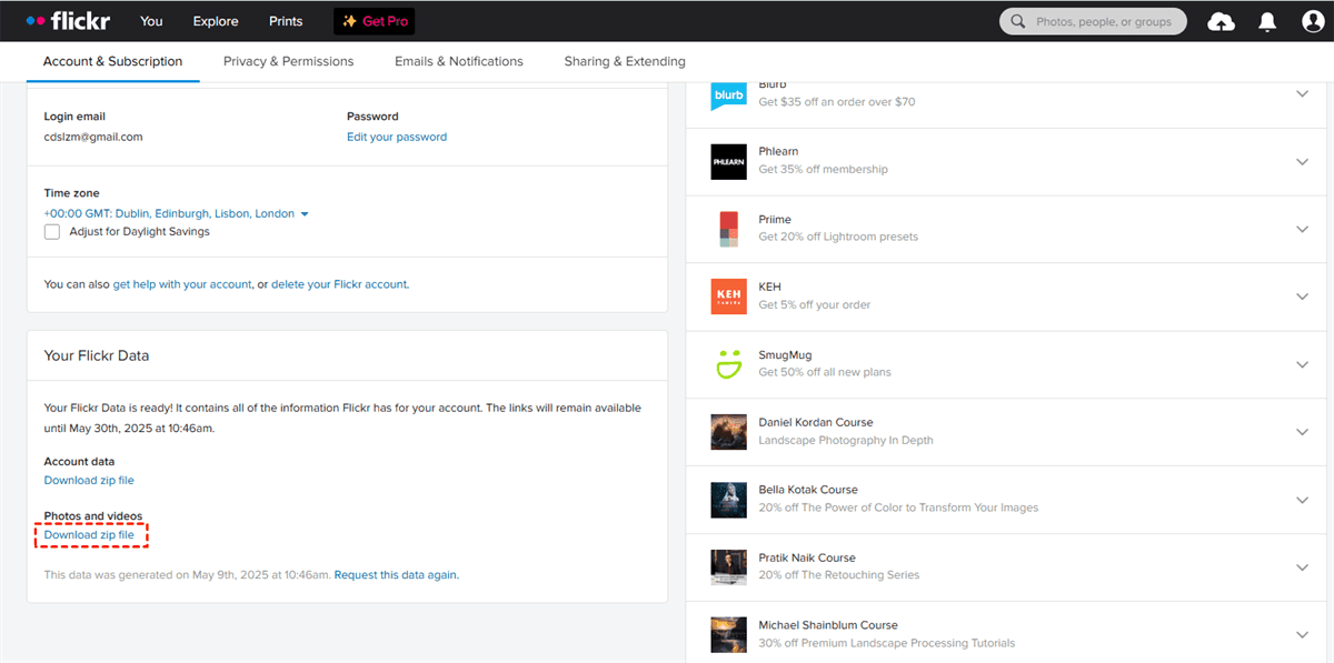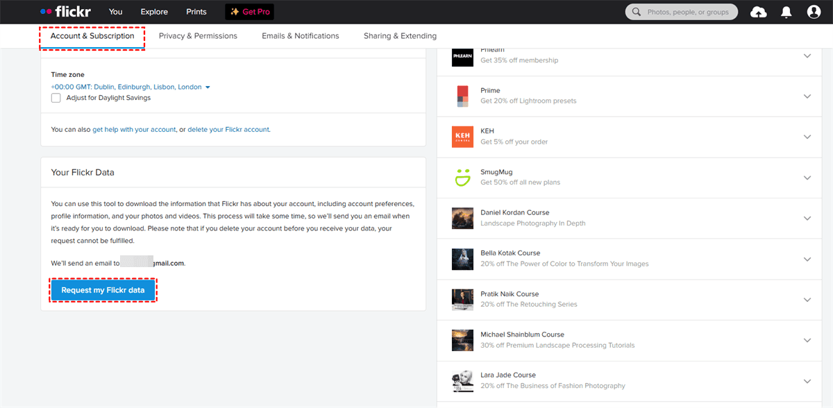 3. At the Account and Subscription section, scroll down and click Request my Flickr data at Your Flickr Data field.