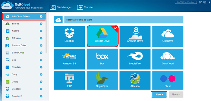 Click on "Add Cloud" on the left and select the Google Drive icon to add Google Drive to MultCloud. Then choose the FTP icon to add FTP server to MultCloud as well.