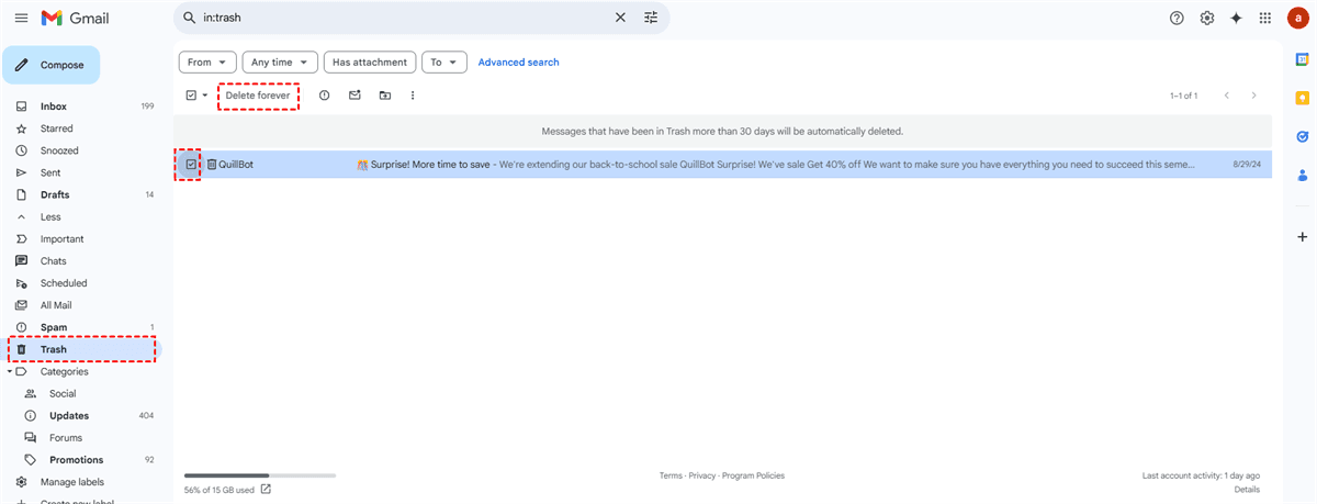 4. Click Trash, and choose all the emails, hit Delete forever. Or just click Empty trash now.
