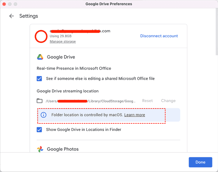 But you might encounter the message: Folder location is controlled by macOS, because the File Provider API restricts it. You can switch from streaming to mirroring to change the folder location.