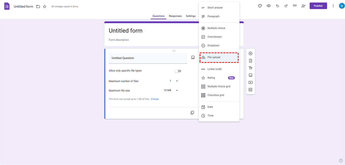 Step 3. Open an option and tap on the “Multiple choice” box. Then, change it to “File upload”. After that, read the notice given on the screen and click “Continue”.