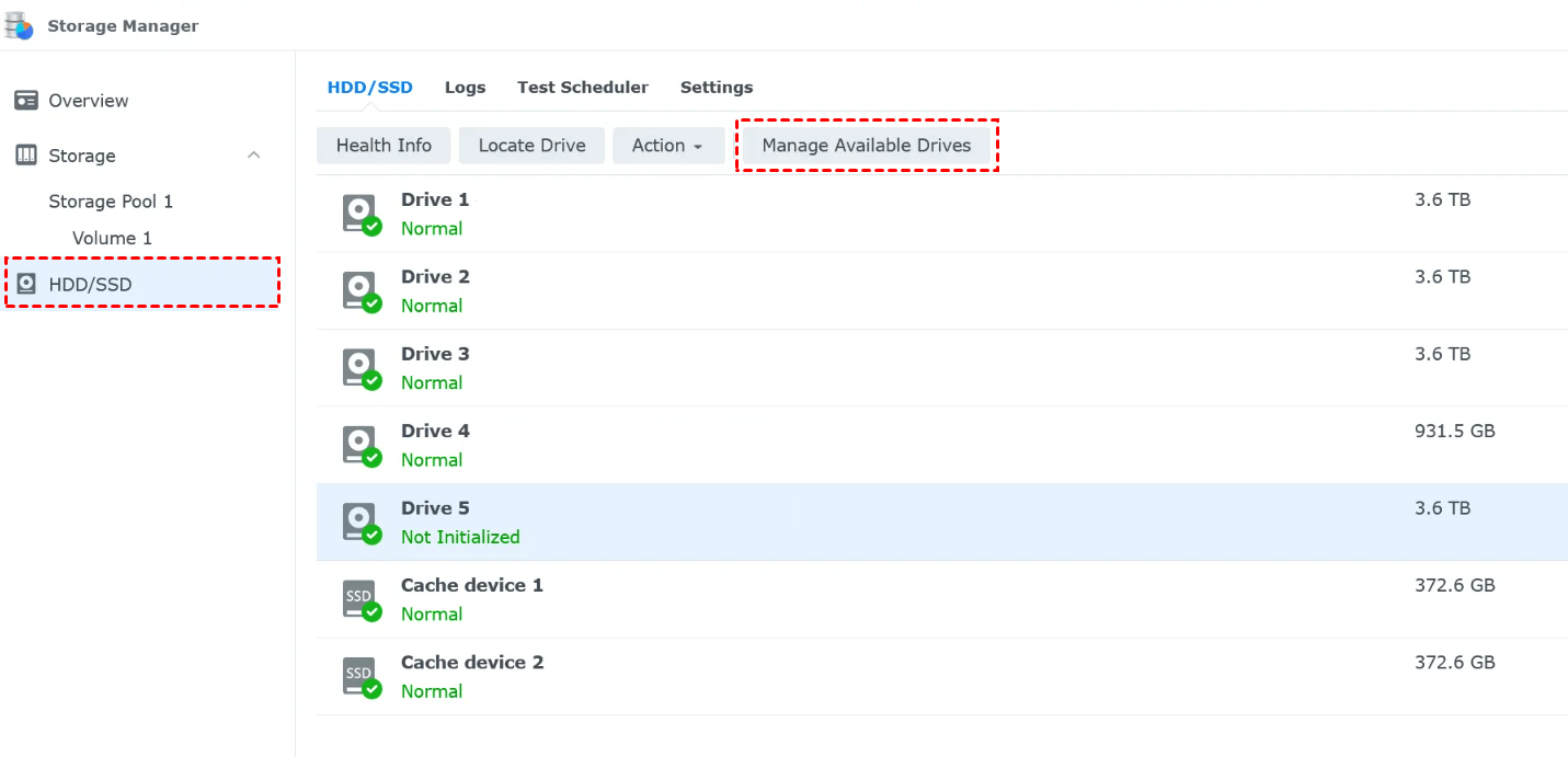 Go to Main Menu > Storage Manager. Then, click HDD/SSD to verify the new drive is recognized.