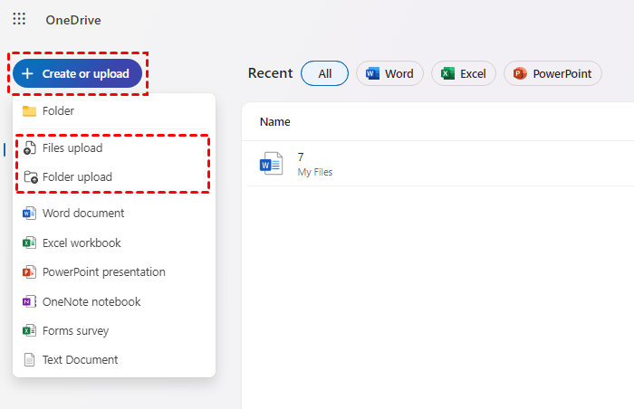 Step 4. Select “Files upload” or “Folder upload”, choose the downloaded files, and click “Open” to upload them to OneDrive.