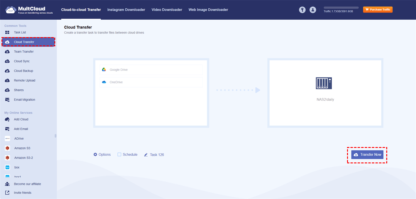 MultCloud can help you manage multiple clouds on one website. It also offers functions like Cloud Transfer, Cloud Sync, Cloud Transfer, Team Transfer, Email Migration, and more. To migrate files from other clouds to NAS, Cloud Transfer is the best choice.