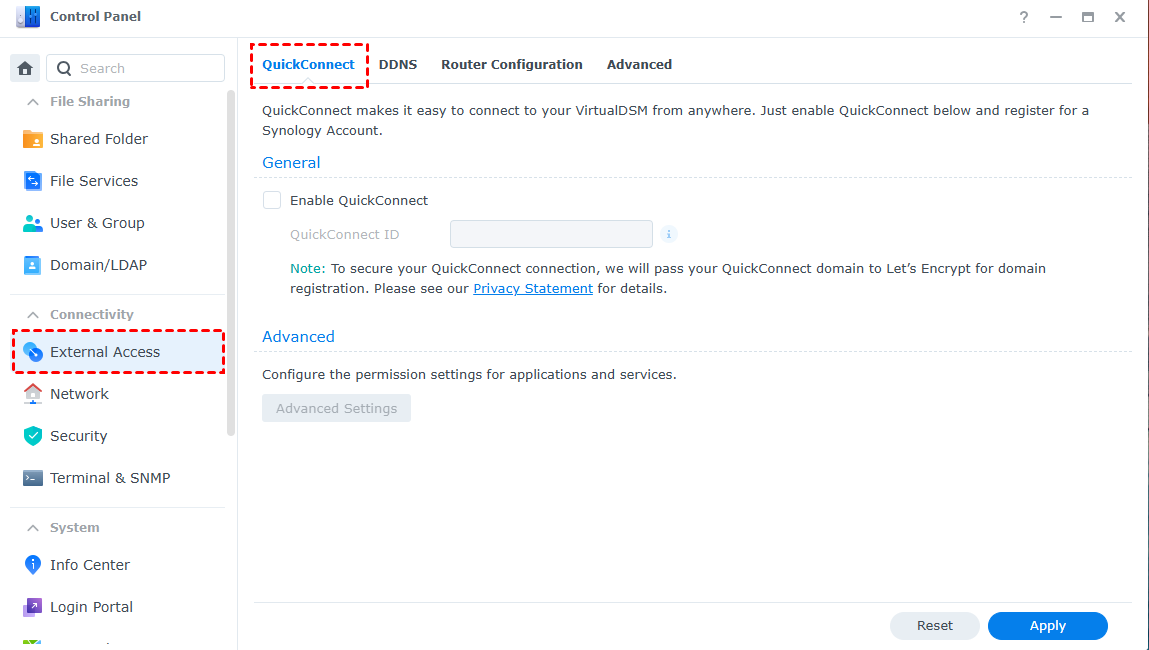 Step 2. Choose âExternal Accessâ and go to the âQuickConnectâ button.