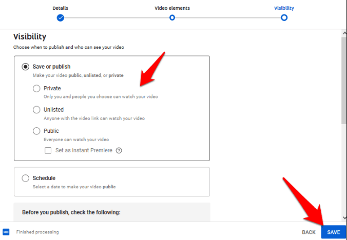 Pick a catchy thumbnail or upload your own. Then set the visibility to Public, Private, or Unlisted, depending on your intent.