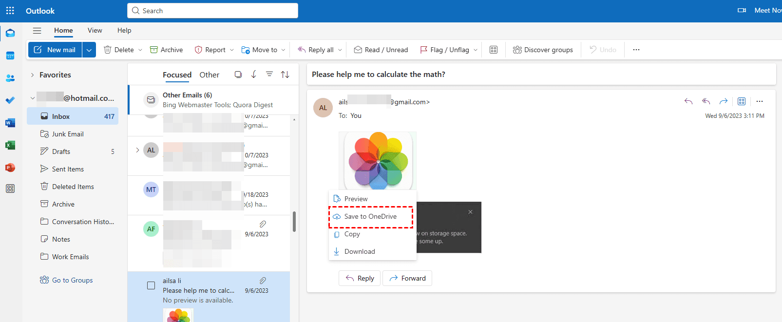 3. Hover over the attachments, tap the down arrow, and choose Save to OneDrive.