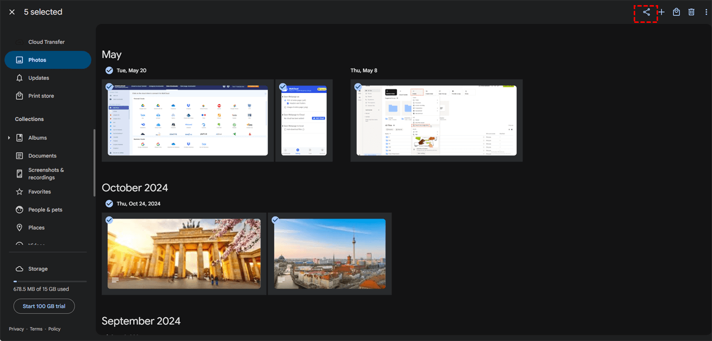 Apart from using MultCloud to create a sharing link, you can also directly get a link to your desired photos on Google Photos. Then, upload Google Photos to Facebook by sharing this link. However, in this way, you cannot encrypt the photos with a password.