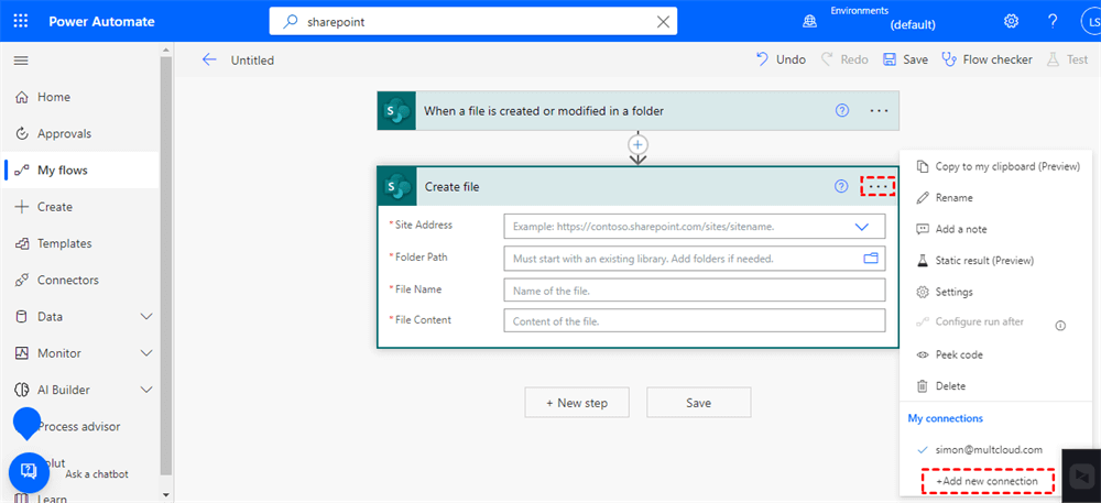 Step 5. Click the three-dot icon beside and choose “+ Add new connection”. Then sign in to another SharePoint account.