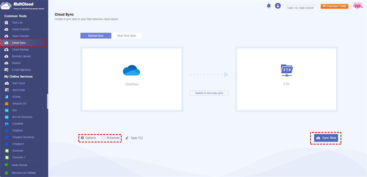 Step 3: Click âCloud Syncâ in the left sidebar. Then, choose OneDrive and SFTP as the source and target clouds.