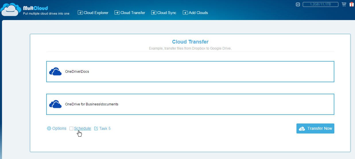 Click on "Cloud Transfer", select OneDrive as the source, select OneDrive for Business as the destination, click “Transfer Now” and MultCloud will transfer files between OneDrive personal and business accounts at once.