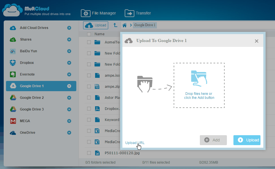 How to directly save web files to Google Drive without downloading? With a FREE web-based cloud file transfer manager, MultCloud, you can save any files from the web directly to your Google Drive without downloading and uploading. You can enter the web file’s address, and in an instant, the file will be available in your Google Drive. Of course, you need to add Google Drive account into MultCloud beforehand, so you can select a folder in your Google Drive to receive this web file.