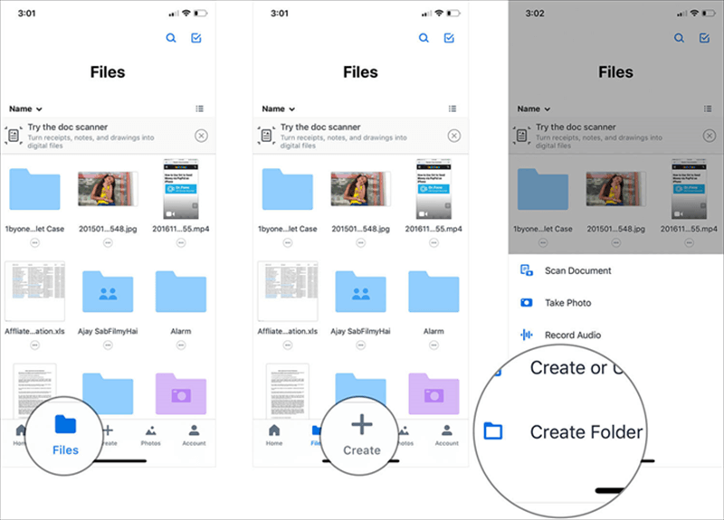 Step 1. Open the Dropbox app, then tap the "Files" tab → tap "+ Create" → tap "Create Folder". After that, you can give this folder a name. This way, after uploading pictures to this folder, you can view them easily.
