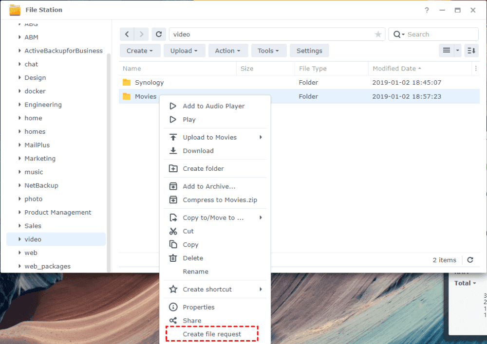 - Create a new shared folder in Synology NAS. File requests can only be created within shared folders. If no shared folders are available, the create a file request option will be grayed out.