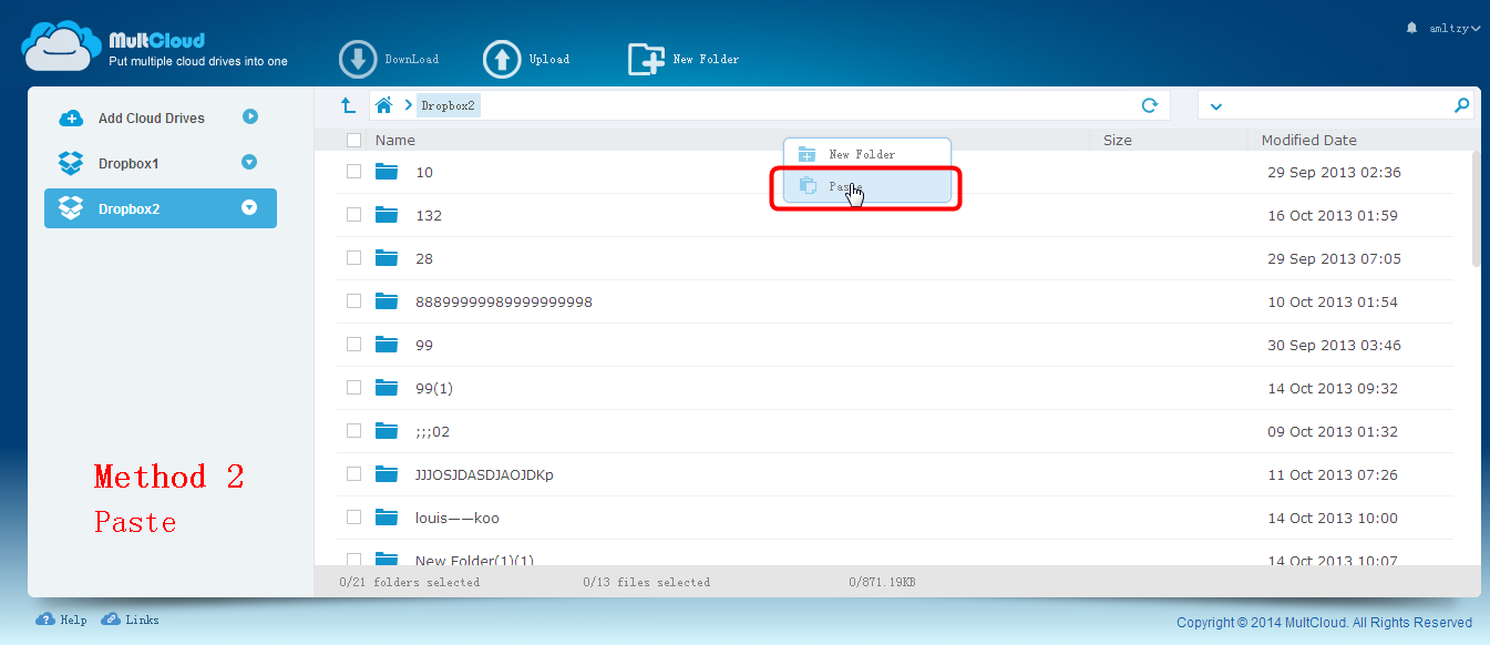 Select the target folder from Dropbox2 and drag it to Dropbox1 by holding the left mouse button like in Windows. (This method needs to return to the old version of MultCloud, please click "Switch to classic MultCloud" in the lower left corner to enter.)