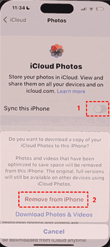 4. Click Remove from iPhone to confirm, that all the photos and videos will be deleted from your iPhone device, and keep them only on iCloud.