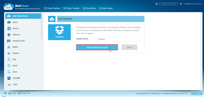 Step 3. Click “Add Cloud” again and choose the Dropbox icon to allow MultCloud to access your Dropbox account as well.