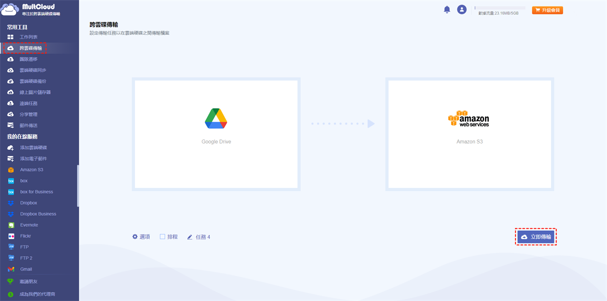 步驟3.進入「跨雲碟傳輸」部分,點選「來源」和「目的地」分別選擇Google Drive和Amazon S3作為來源和目標。然後點選「立即傳輸」即可開始轉帳任務。