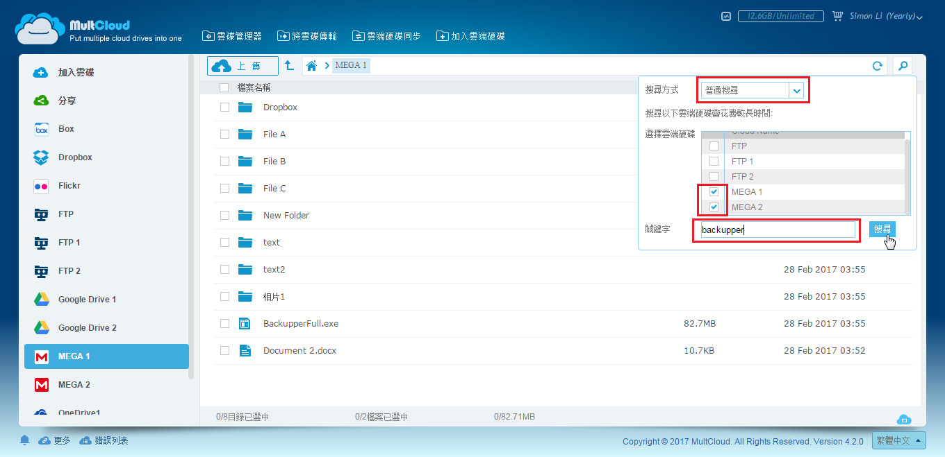 下面我們要介紹的這款多雲端硬碟管理app - MultCloud,就能讓您只需一次登入,即可合併管理多個MEGA帳號,不必在不同MEGA帳號間進行切換。而且使用起來就像Windows Explorer(Windows檔案總管)那樣簡單。您透過“複製(剪下)”+“貼上”,輕鬆地將檔案從一個MEGA帳號傳送至另一個。如果您想要搜尋特定檔案,也只需輸入關鍵字,MultCloud就能透過一個介面列出儲存在不同MEGA帳號的相關檔案。下面我們將透過一個簡單的教程,教會您如何使用MultCloud這一個app來搜尋儲存在不同MEGA帳號的特定檔案