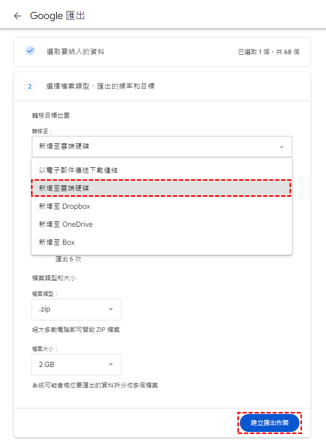 步驟4. 選擇「新增至雲端硬碟」作為傳送方法,然後單擊藍色按鈕「建立匯出作業」。