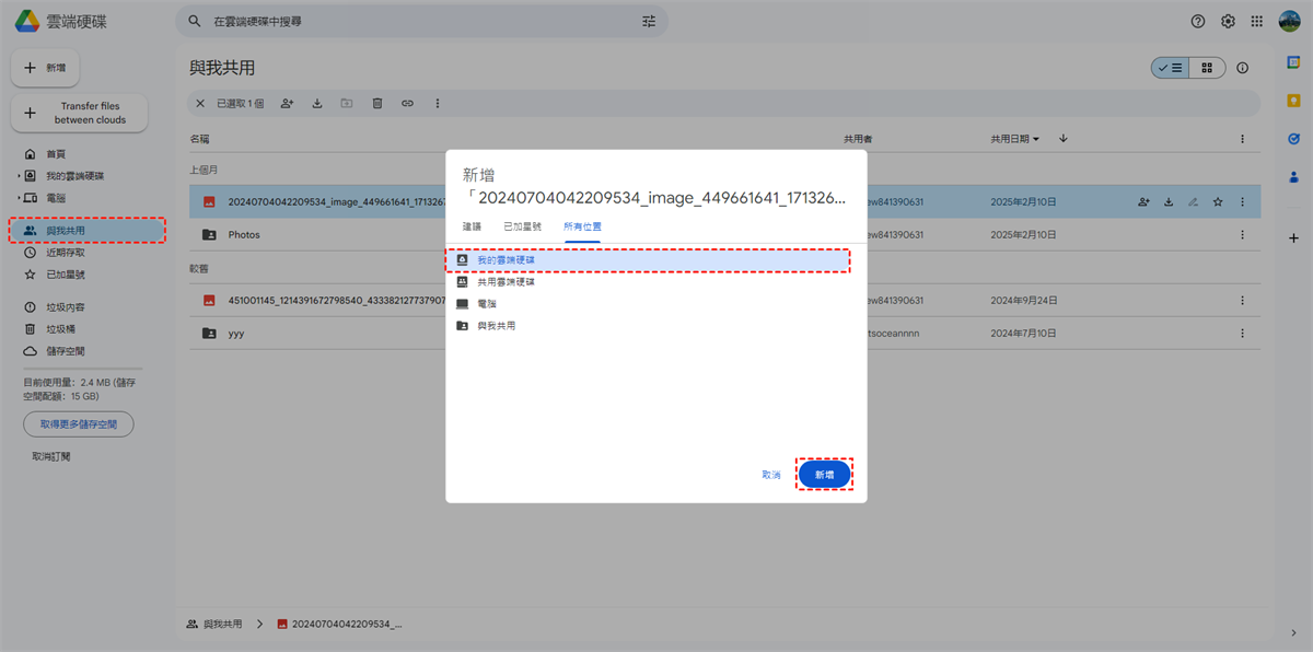 方法3:自動將檔案從「與我共用」傳輸到「我的雲端硬碟」