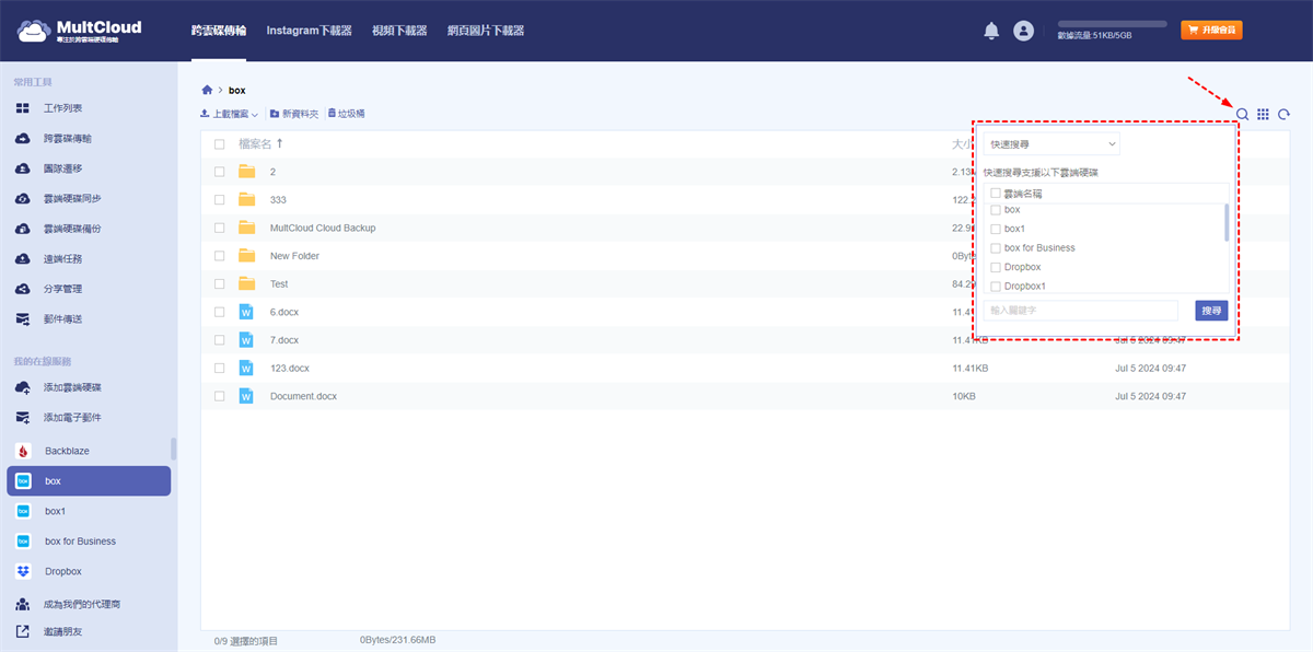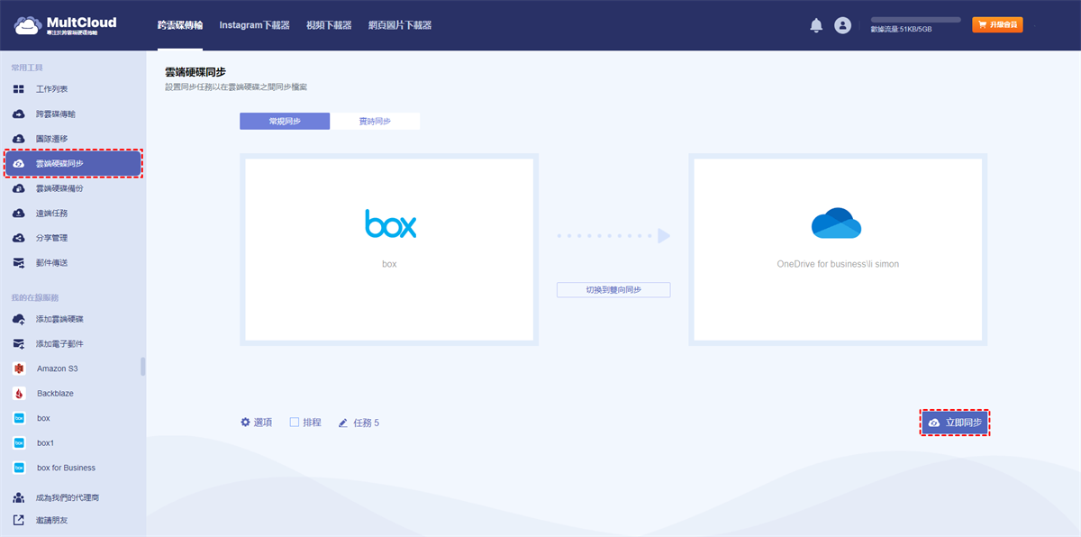 按照MultCloud提供的「雲端硬碟同步」方法,您可以輕鬆同步Box和OneDrive。除了同步功能外,MultCloud還具有許多進階功能,包括跨雲碟傳輸、團隊遷移、雲端硬碟備份和遠端任務等。