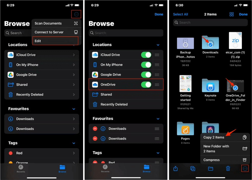 步驟3. 在「檔案」中打開OneDrive,然後複製將要轉移到iCloud雲碟的檔案和資料夹。